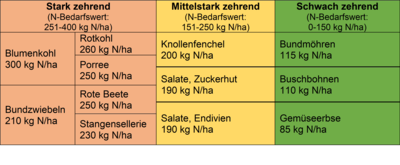 - Es werden drei repräsentative Gruppen gebildet. Dazu wurden in diesem Beispiel die Kulturen nach Schwach-, Mittel- und Starkzehrern sortiert. Die Grundlage hierfür bildet die Tabelle 2. Aus den drei Gruppen wird jeweils eine Kultur ausgewählt, die die ganze Gruppe repräsentativ darstellt. So wird eine Überversorgung der Schwachzehrer und eine Unterversorgung der Starkzehrer vermieden.