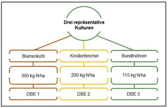 Wenn auf zusammengefassten Flächen nach § 3 Absatz 2 Satz 3 verschieden Kulturen angebaut werden, kann gemäß § 4 Absatz 1 Nr. 2 DüV für die DBE entweder ein durchschnittlicher N-Bedarfswert der angebauten Kulturen angenommen werden oder die Ermittlung beispielhaft für drei Gemüsekulturen mit unterschiedlichen N-Bedarfswerten (z. B. Stark-, Mittel, Schwachzehrer) erfolgen. In Abbildung 1 ist dargestellt, wie eine Zusammenlegung von diesen Schlägen möglich ist.