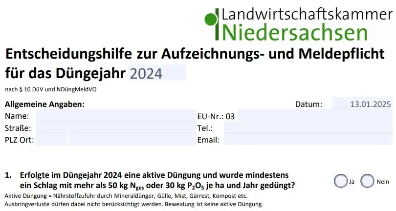 Zur Überprüfung der Aufzeichnungspflicht können Sie außerdem das interaktive PDF-Formulars "Entscheidungshilfe zur Meldepflicht“ nutzen. Sollte Ihr Betrieb nicht aufzeichnungs- und meldepflichtig sein, weil z.B. zwar mehr als 15 ha Fläche bewirtschaftet, alle Flächen aber nur sehr extensiv oder gar nicht gedüngt werden, können Sie uns das ausgefüllte Formular übermitteln (Download unten auf dieser Seite).